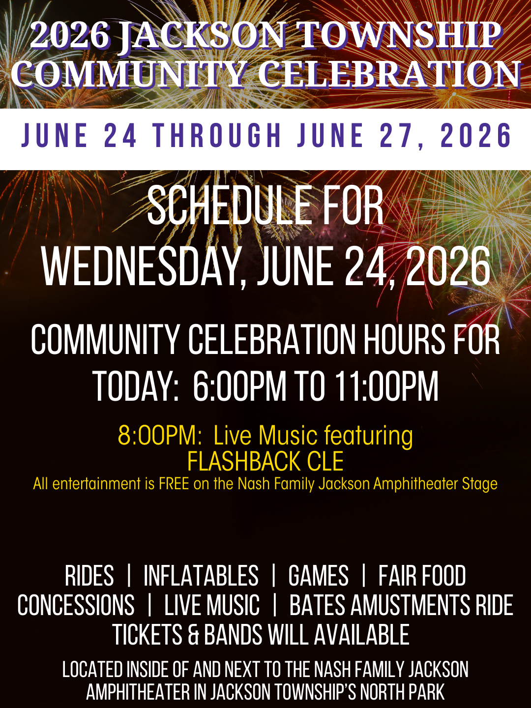 Nash Family Jackson Amphitheater 7454 Community Pkwy NW, Massillon, OH, United StatesThe 2026 Jackson Community Celebration features food, rides, games, craft market, live entertainment and more! Community Celebration Hours: Wed 6/24 6:00pm to 11:00pm Thu 6/25 6:00pm to 11:00pm Fri 6/26…