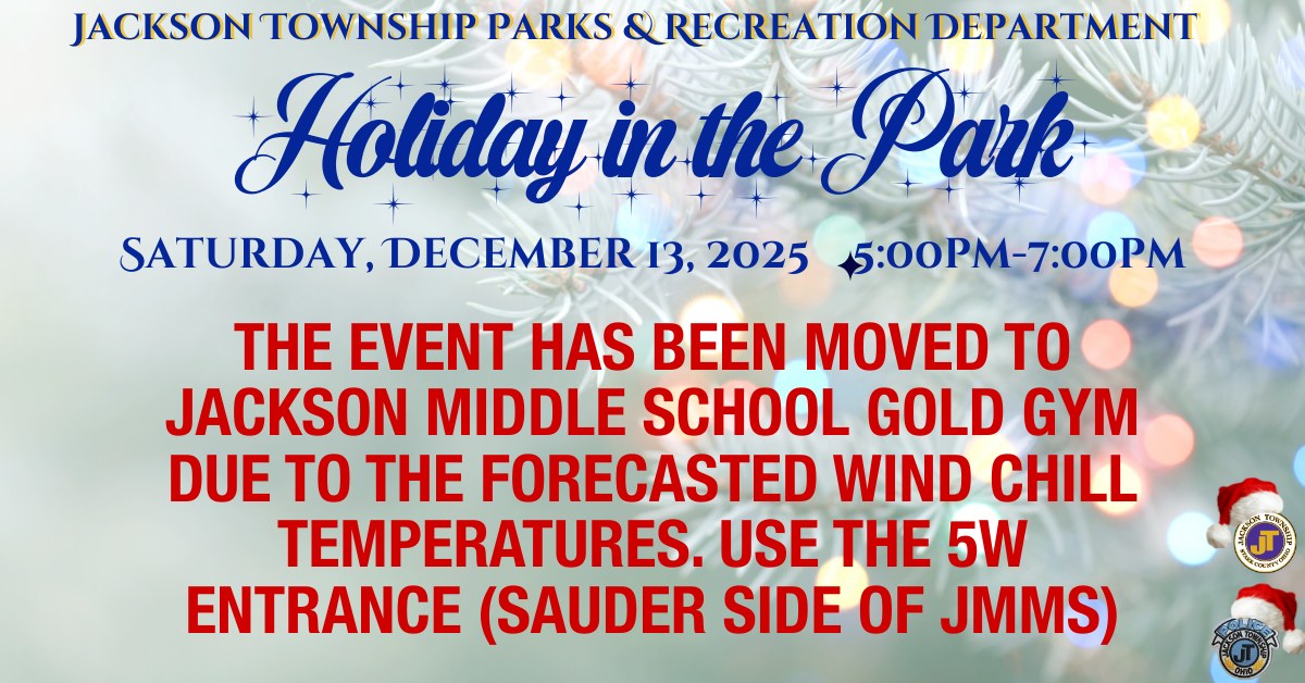 North Park 7660 Fulton Rd. NW, Massillon, OH, United StatesJackson Township's 2025 Holiday in the Park will be held on Saturday, December 13, 2025 from 5:00pm to 7:00pm at the David Ruwadi Pavilion at North Park. Santa & Mrs.…