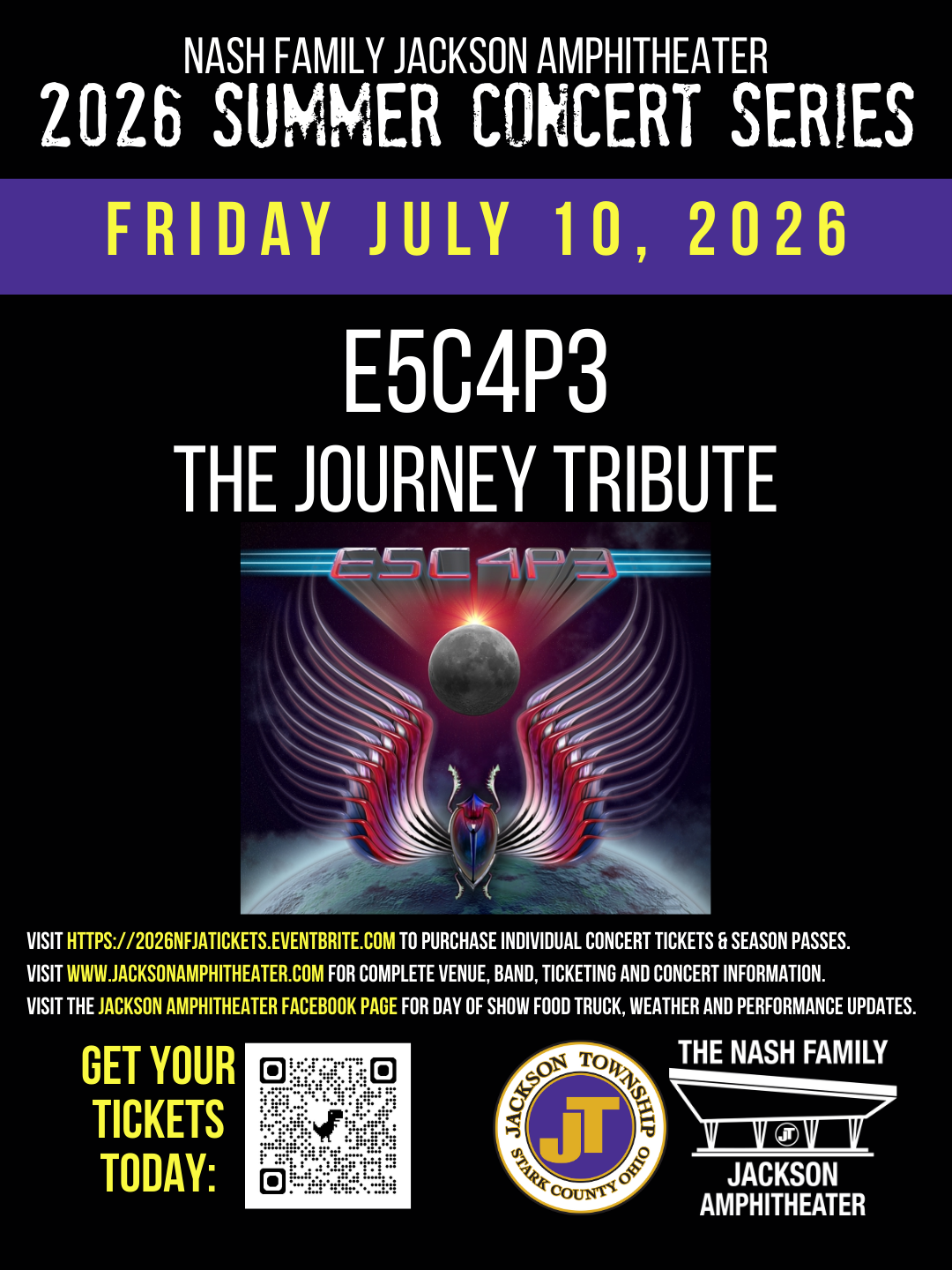 Nash Family Jackson Amphitheater 7454 Community Pkwy NW, Massillon, OH, United StatesGet your tickets today for E5C4P3 THE Journey Tribute at the Nash Family Jackson Amphitheater. Please visit www.jacksonamphitheater.com for full concert, band and venue information, plus links for ticket purchase.