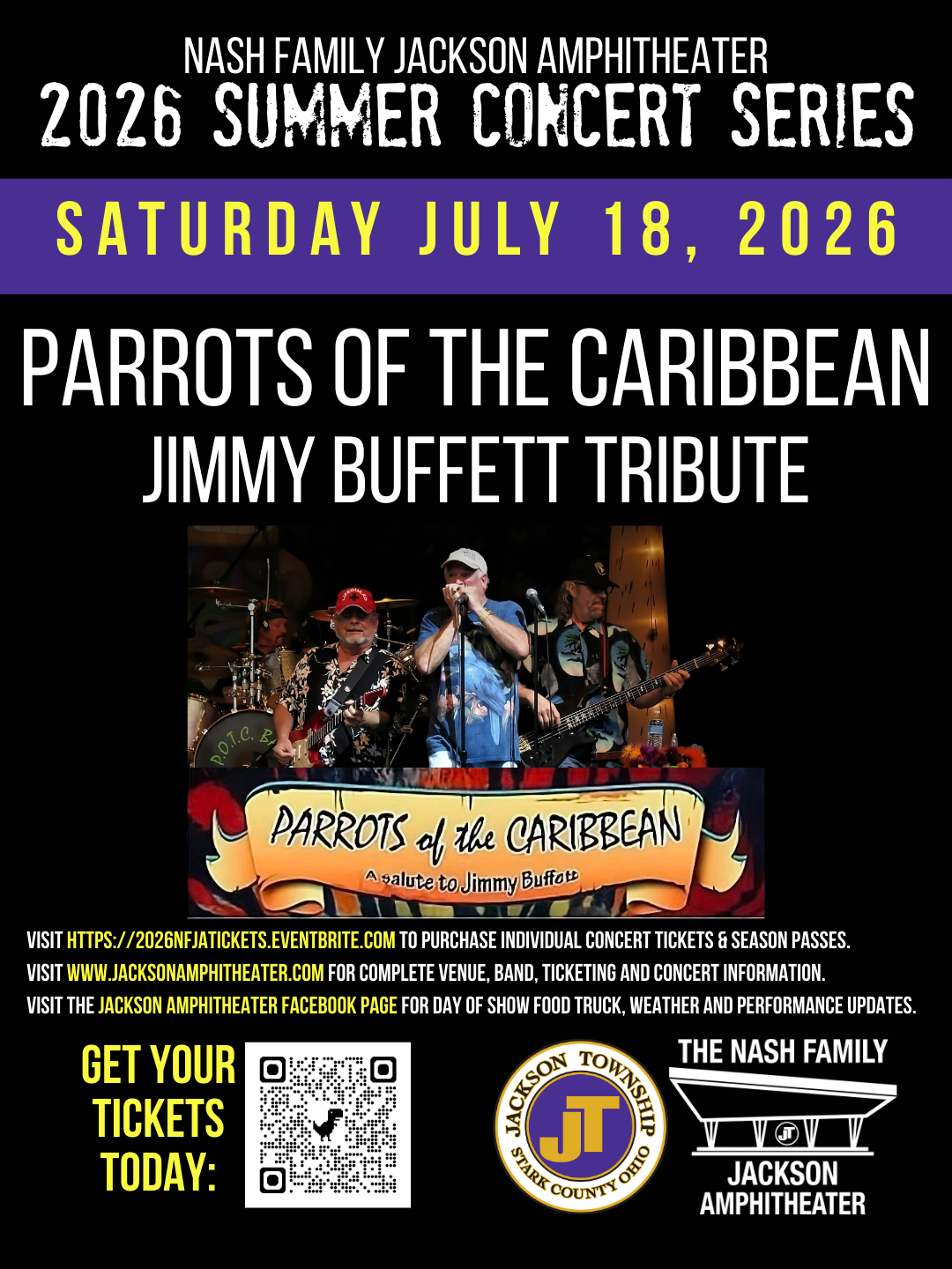 Nash Family Jackson Amphitheater 7454 Community Pkwy NW, Massillon, OH, United StatesGet your tickets today for Parrots of the Caribbean, Jimmy Buffett Tribute at the Nash Family Jackson Amphitheater. Please visit www.jacksonamphitheater.com for full concert, band and venue information, plus links…