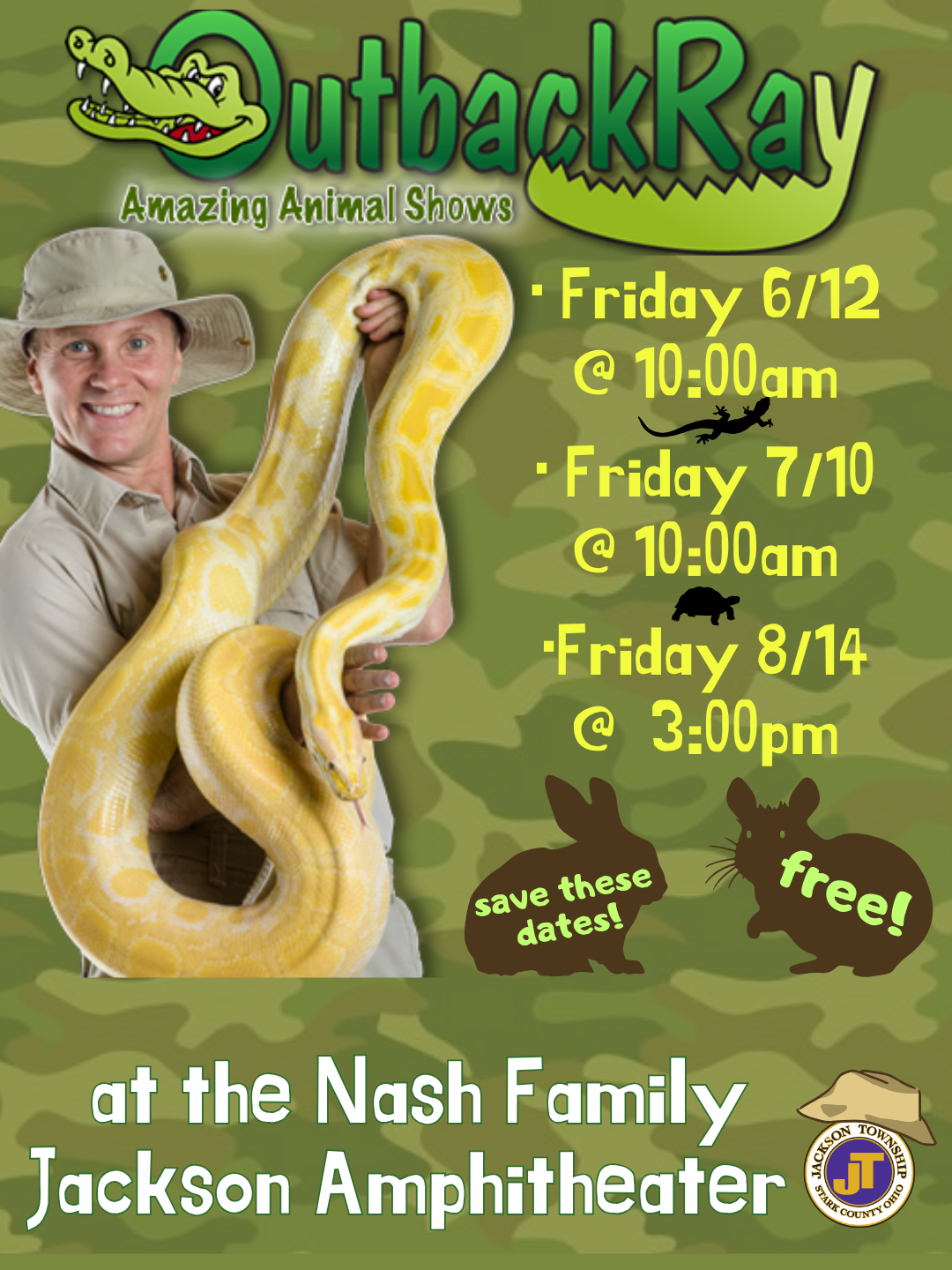 Nash Family Jackson Amphitheater 7454 Community Pkwy NW, Massillon, OH, United StatesGet ready for an unforgettable experience with Outback Ray's Amazing Animal Show! This action-packed, hands-on adventure is guaranteed to captivate and entertain guests of ALL ages. Outback Ray brings a…