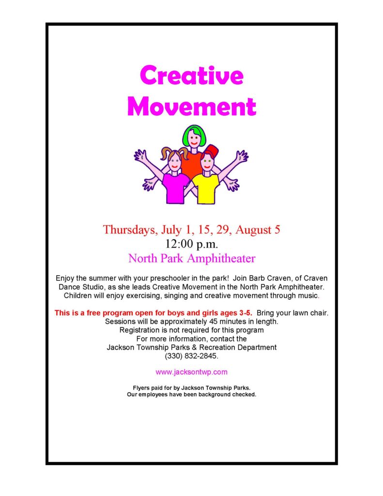 Creative Movement 12:00 p.m. North Park Amphitheater Enjoy the summer with your preschooler in the park! Join Barb Craven, of Craven Dance Studio, as she leads Creative Movement in the…
