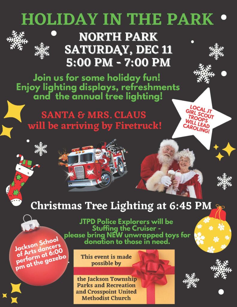 Holiday in the Park, Saturday, December 11, 2021, at 5:00 P.M. to 7:00 P.M. Join us for some holiday fun at the gazebo in North Park! Enjoy lighting displays, refreshments…