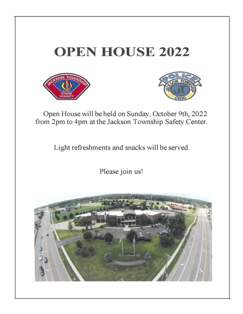 Annual Safety Center Open House will be held on Sunday, October 9, 2022 from 2pm to 4pm at the Jackson Township Safety Center.