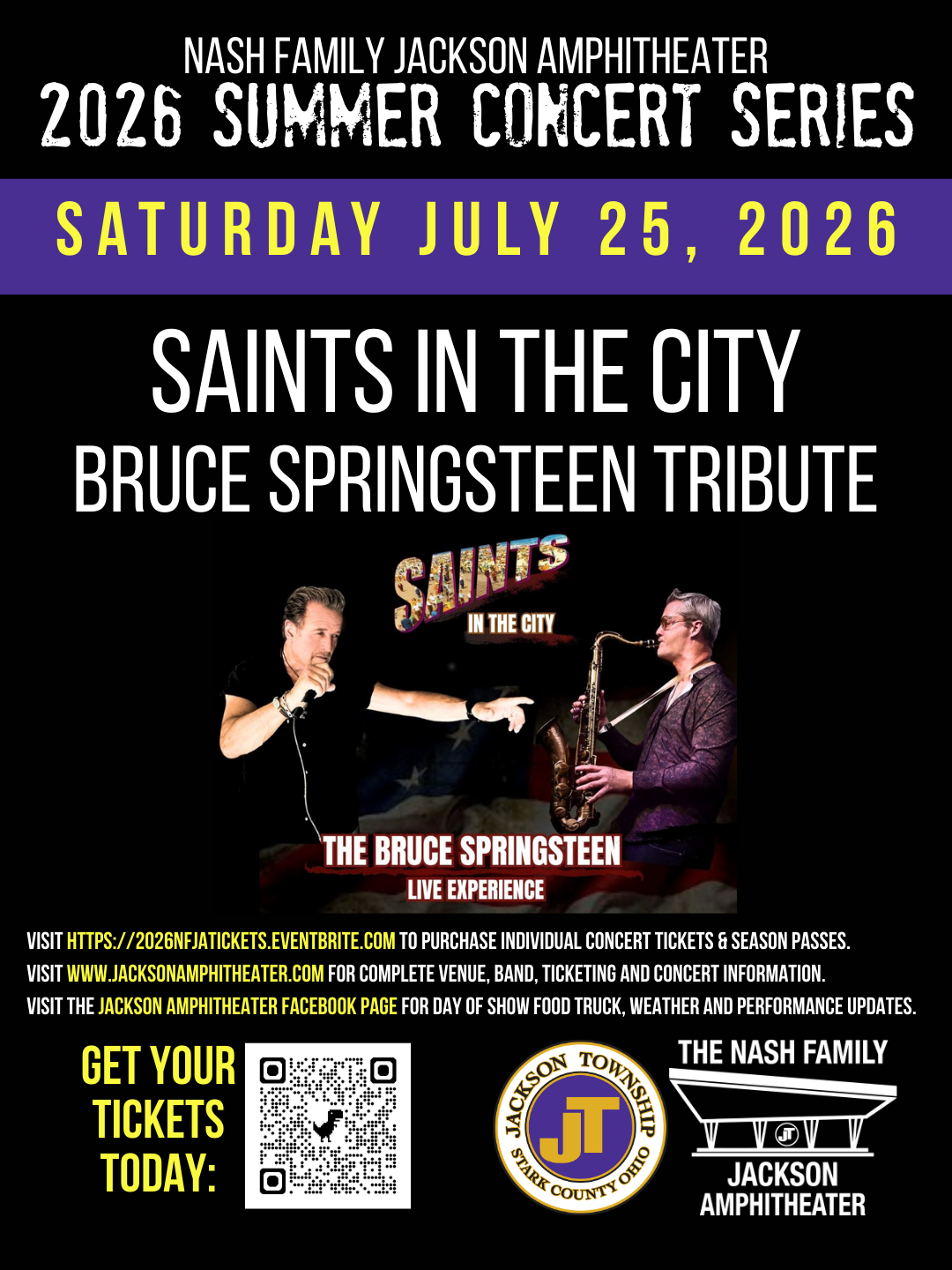 Nash Family Jackson Amphitheater 7454 Community Pkwy NW, Massillon, OH, United StatesGet your tickets today for Saints in the City Bruce Springsteen Tribute at the Nash Family Jackson Amphitheater. Please visit www.jacksonamphitheater.com for full concert, band and venue information, plus links for ticket purchase.