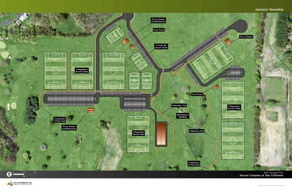 It will cover a 40-acre tract at the end of Belden Greens Circle NW, a road that is part of development at the former Tam O'Shanter golf course. Plans show seven regulation soccer fields and four smaller soccer fields, as well as parking, picnic shelters and rest rooms, and areas for food trucks.
