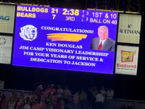 On Friday, October 6 during half time of the Jackson football game, Trustee Justin Hardesty presented Ken Douglas with the Jim Camp Visionary Leader Award from the Jackson Local Schools Foundation for his years of service and dedication to Jackson Township.