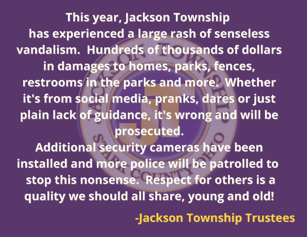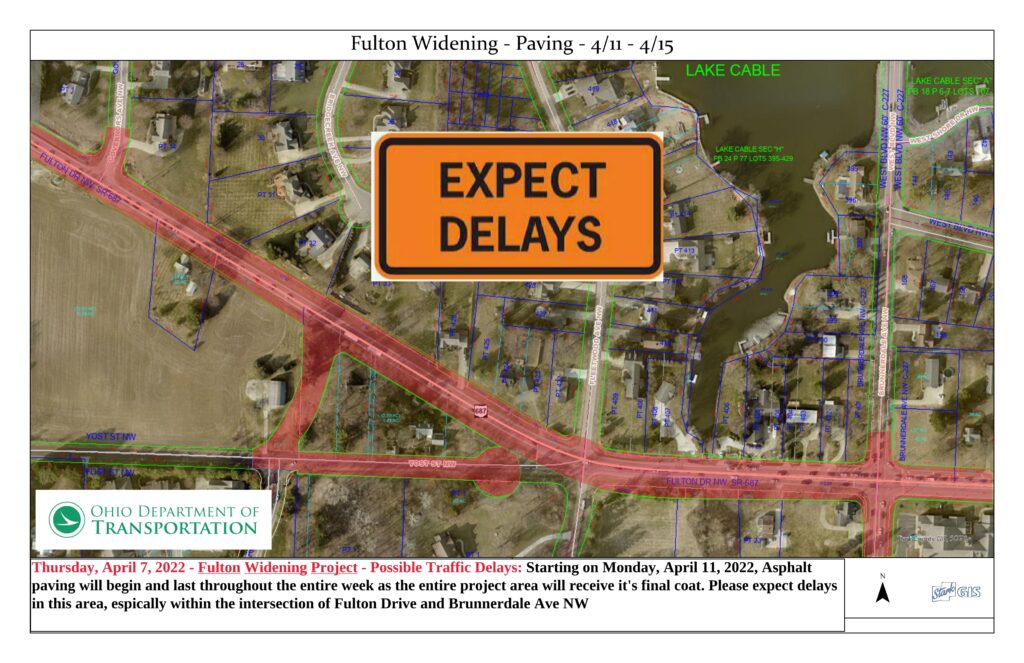 FULTON DRIVE NW – 60 DAY ROAD CLOSURE: FULTON DRIVE NW WILL BE CLOSED TO ALL THRU TRAFFIC FOR 60 DAYS STARTING ON MONDAY, JUNE 20th, 2022 through SATURDAY, AUGUST 13th, 2022 due to the construction of the Fulton Tunnel. All traffic will be detoured to Arlington Ave NW to Portage St NW to SR-241 (Wales Avenue) from the West and SR-241 (Wales Avenue) to Mudbrook Street NW to Arlington Avenue NW from the west. The Jackson Township Yard Waste Site and Jackson Township’s South Park will be accessible from South Park Drive NW on the West side of…