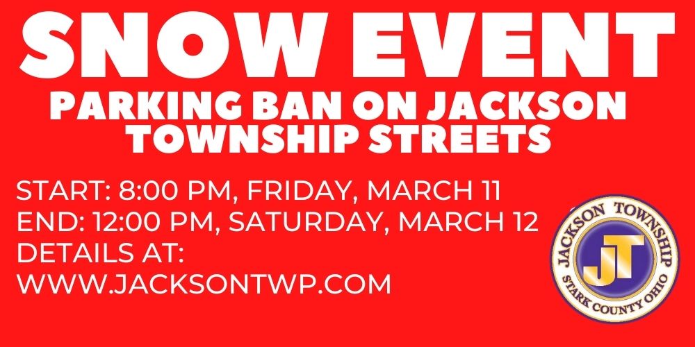 Read MoreIMMEDIATE RELEASE: March 11, 2022 at 3:15 p.m. DUE TO EXPECTED SNOW AND ICE ACCUMULATION OF TWO INCHES OR MORE, THE JACKSON TOWNSHIP BOARD OF TRUSTEES HAS ISSUED A SNOW EMERGENCY PROHIBITING PARKING ON JACKSON TOWNSHIP STREETS EFFECTIVE AT 8:00 PM FRIDAY, MARCH 11, 2022. THE SNOW EMERGENCY PARKING BAN WILL REMAIN IN EFFECT UNTIL 12:00 PM, SATURDAY, MARCH 12, 2022. FOR FURTHER INFORMATION, PLEASE CALL 330-832-4016 DURING REGULAR BUSINESS HOURS.