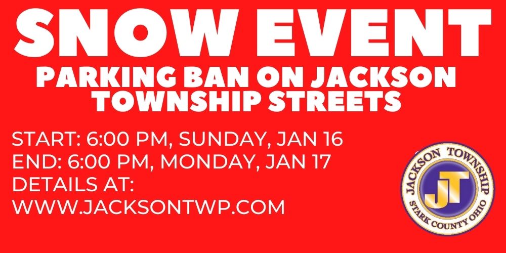 Read MoreDUE TO EXPECTED SNOW AND ICE ACCUMULATION OF TWO INCHES OR MORE, THE JACKSON TOWNSHIP BOARD OF TRUSTEES HAS ISSUED A SNOW EMERGENCY PROHIBITING PARKING ON JACKSON TOWNSHIP STREETS EFFECTIVE AT 6:00 PM SUNDAY, JANUARY 16, 2022. THE SNOW EMERGENCY PARKING BAN WILL REMAIN IN EFFECT UNTIL 6:00 PM, MONDAY, JANUARY 17, 2022. FOR FURTHER INFORMATION, PLEASE CALL 330-832-4016 DURING REGULAR BUSINESS HOURS.