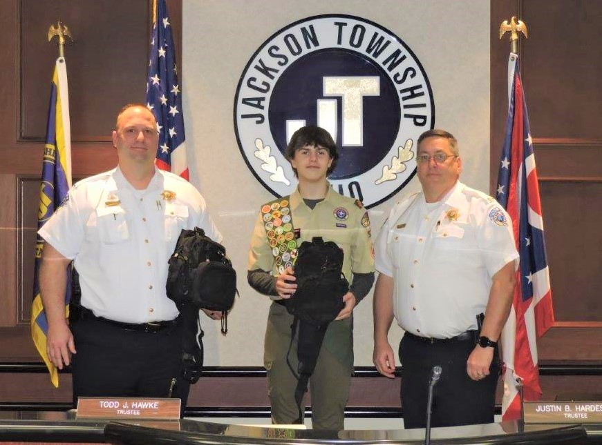 Read MoreAt the March 4, 2023, Jackson Township Board of Trustees meeting, Boy Scout Joseph Lynn from Troop 927 presented the Jackson Police Department with 26 Bail Out Bags. As an eagle scout project Joseph raised $4,000 through private donations and purchased the bags. Included in the bags are quikclot, tourniquet, chest seal, nasal airways, door stoppers, scissors, window breakers, zip-ties, gloves and a sharpie. Joseph said, “I hope that someday if there is ever a tragedy in Jackson Township, that these bags can save lives” Thank you, Joseph, for including us in your Eagle Scout Project.