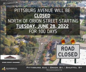 Pittsburg Ave will be closed to through traffic starting Tuesday, June 28, 2022 for one hundred (100) days. The closure will be on Pittsburg Ave immediately north of Orion St. Traffic must re-rout using Orion St, Pittsburg Ave, Shuffel St, Frank Ave and Mt. Pleasant St. Detour signs will be posted and access will be maintained to all parcels. Traffic will be able to travel from Orion Street to Shuffel Street, utilizing Pittsburg Ave.